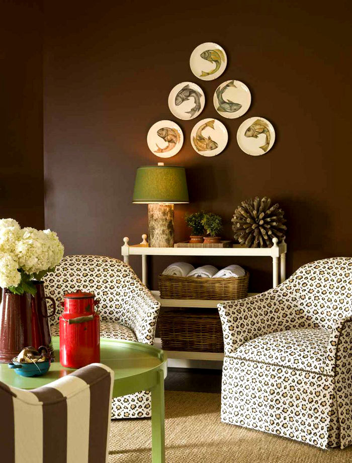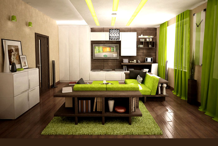 Kopi dan warna hijau muda dapat menjadikan ruang tamu lebih cerah dan lebih tenang pada masa yang sama.