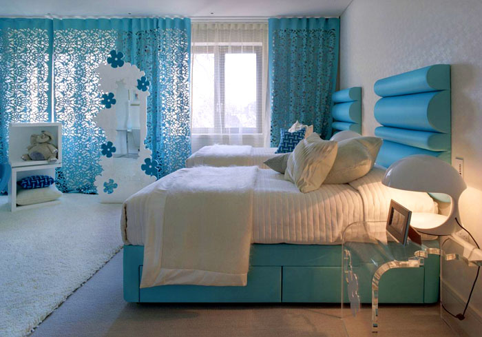 Nada sejuk menyegarkan, mengisi ruang dengan tenaga secara visual, dan bilik menjadi segar. Dalam warna seperti itu lebih mudah untuk bangun dan bersorak, walaupun pada hakikatnya palet boleh menjadi "musim sejuk".