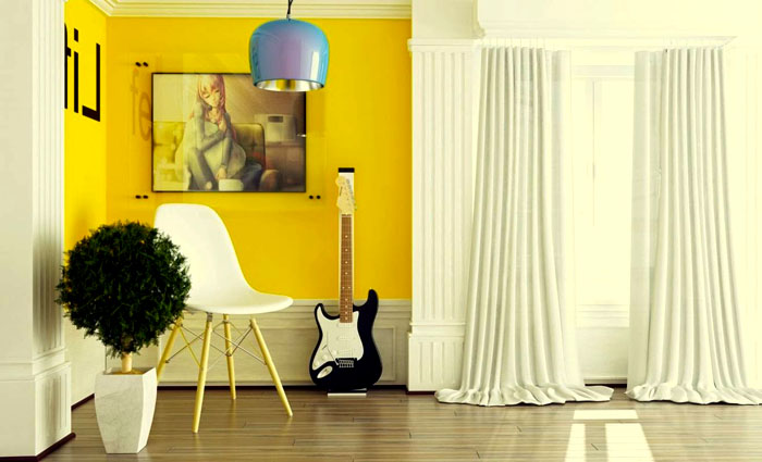 Warna kuning air di kawasan pedalaman: Foto; ciri dinding, lantai, siling berwarna kuning air; persepsi warna kuning air di pedalaman; gabungan kuning air dengan warna putih, merah jambu, hijau muda, ungu, biru dan coklat; kuning air dalam klasik, moden, provence, negara dan minimalis.
