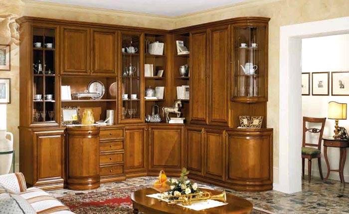 Perabot kabinet ruang tamu gaya klasik dicirikan oleh kehadiran hiasan yang memberikan perabot yang cantik dan canggih. Pilihan dibuat untuk memilih cornice, konsol, untuk pembuatan kayu semula jadi yang digunakan. Fasad itu sendiri dibuat khas dari spesies kayu berharga.