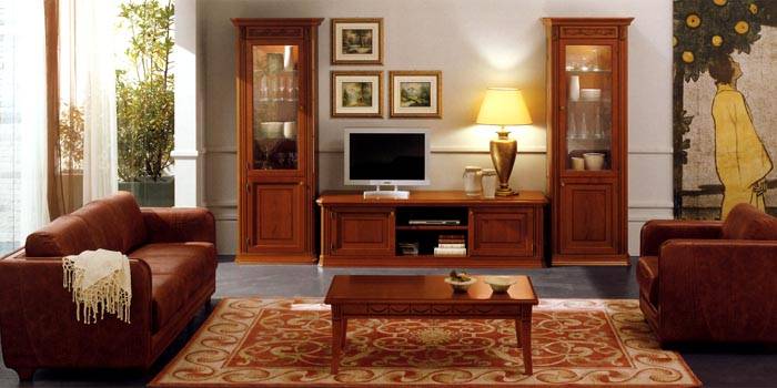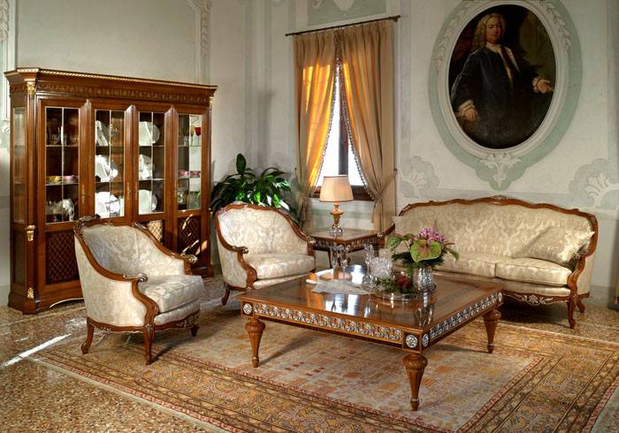 Perabot klasik untuk ruang tamu dicirikan oleh kecanggihan, besar-besaran, kos tinggi, penggunaan bahan penamat semula jadi dan elemen hiasan yang elegan dalam proses pembuatannya. Untuk pelapisan, logam, batu atau kain pelapis mewah digunakan. Pangkalan perabot biasanya dibuat dari walnut, mahoni, oak atau ceri.