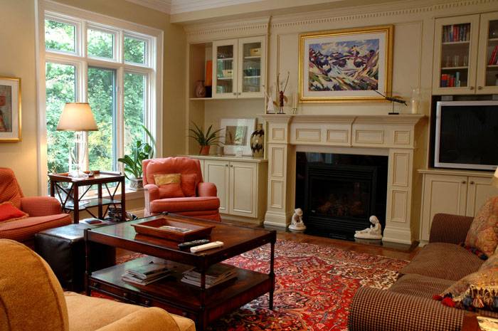 Semasa mula mengatur perabot di ruang tamu, anda harus lebih mengutamakan simetri. Untuk melakukan ini, pada mulanya anda mesti memilih pusat, berbanding dengan perabot selebihnya untuk ruang tamu klasik pada masa akan datang. Foto dalaman yang sudah dihiasi menunjukkan bahawa perapian, meja makan atau kopi, permaidani boleh menjadi pusat dewan. Perabot diatur dengan mengambil kira jumlah kawasan rekreasi.