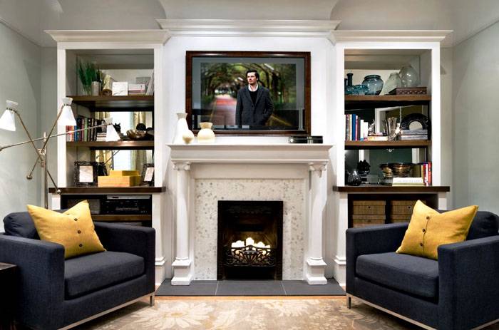 Untuk kesan terbaik, batu semula jadi atau marmar harus digunakan untuk menghias perapian. Di atas perapian, banyak meletakkan rak yang diperbuat daripada bahan yang sama. Dudukan batu boleh digunakan untuk meletakkan pelbagai elemen hiasan: pasu, jam, pelbagai lampu.