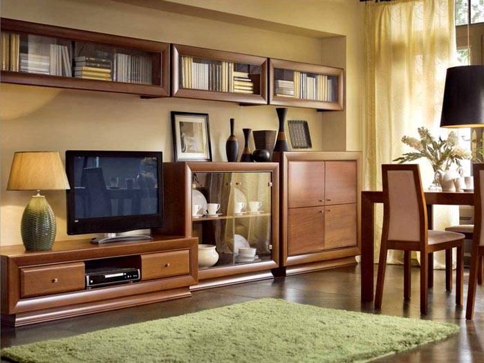 Dengan bantuan perabot ruang tamu modular klasik, anda boleh menghias bahagian dalaman mana pun. Dengan pertolongan mereka, anda dapat mengatur ruang dengan betul, dengan membuang ruang yang ada. Pilihan ini sesuai untuk mereka yang ingin mengubah suasana di bilik mereka secara berkala. Kekurangan hubungan yang ketat antara item individu membolehkan anda menukar modul.
