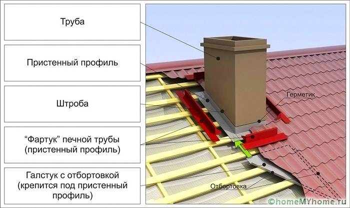 Garis bata cerobong membayangkan penarikan membran kalis air sekurang-kurangnya 50 mm. Alur dibuat di paip itu sendiri, kedalamannya sekurang-kurangnya 15 mm. Air disalurkan ke lembah yang terletak di sekitarnya.