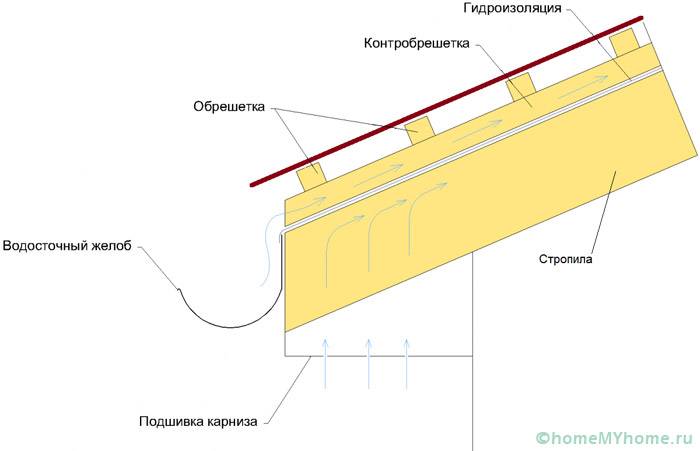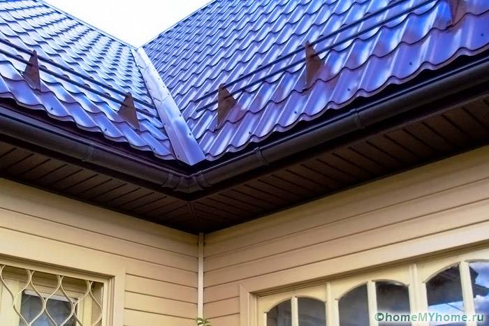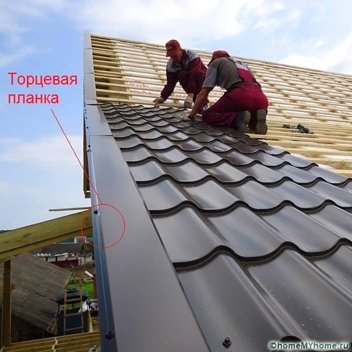 Untuk melindungi ruang berventilasi di bawah bumbung dari penembusan kelembapan dan serpihan jalanan, atap jubin logam sedang dipasang. Pita pengudaraan tambahan mesti dilekatkan pada hujung bar 50x50 mm.