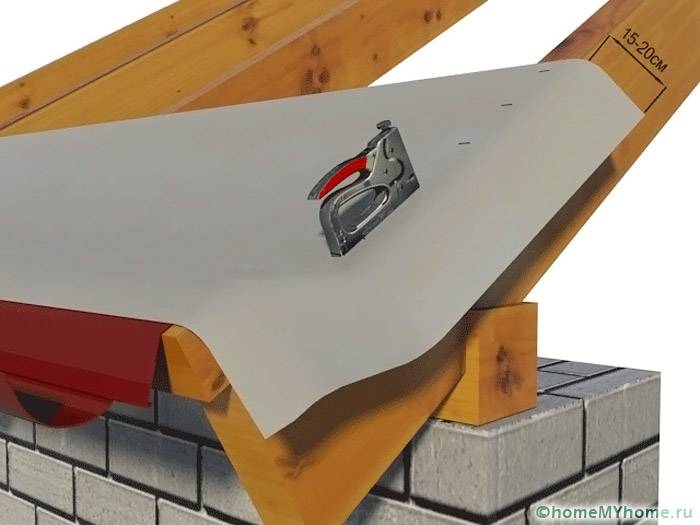 Sekiranya penebat haba akan diletakkan di antara kasau, maka bahan kalis air mesti ada dalam apa jua keadaan. Ia diikat dengan pendakap ke bahagian atap yang menanggung beban. Kanvas tersebar di kaki kasau dengan pertindihan sekurang-kurangnya 15 cm di sepanjang lereng.