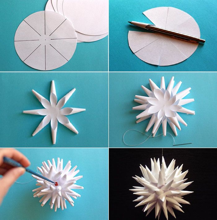 Anda memerlukan beberapa bulatan dengan ukuran yang sama, seperti gambar, gunting, gam dan benang. Sekiranya anda melakukan perkara yang sama dengan setiap elemen seperti templat, anda akan mendapat banyak bintang menarik yang dihubungkan dengan gam menjadi bola yang lembut. Jangan lupa pada saat melekatkan elemen terakhir untuk memasang benang untuk mengikat mainan