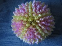 Pangkalan bola busa siap pakai, banyak bunga dalam dua warna dan pin dengan manik di hujungnya. Pin jahit biasa akan berlaku. Setiap bunga dipasang dari dua elemen dan terpaku dengan pin