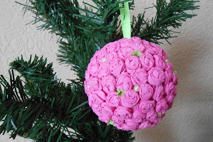 Sekiranya anda membuat beberapa bola berukuran berbeza dengan hiasan bunga, maka pokok Krismas akan dihiasi dengan gaya yang sama.