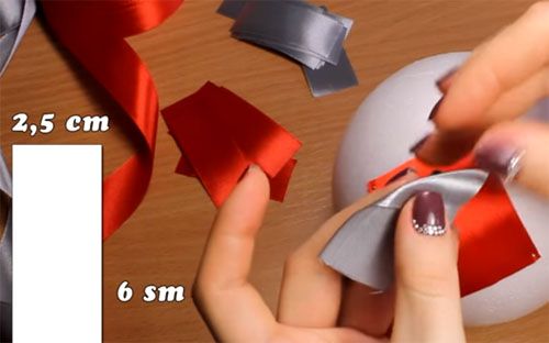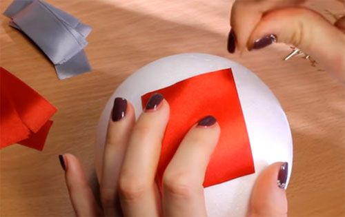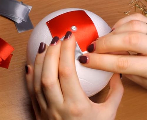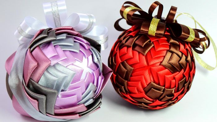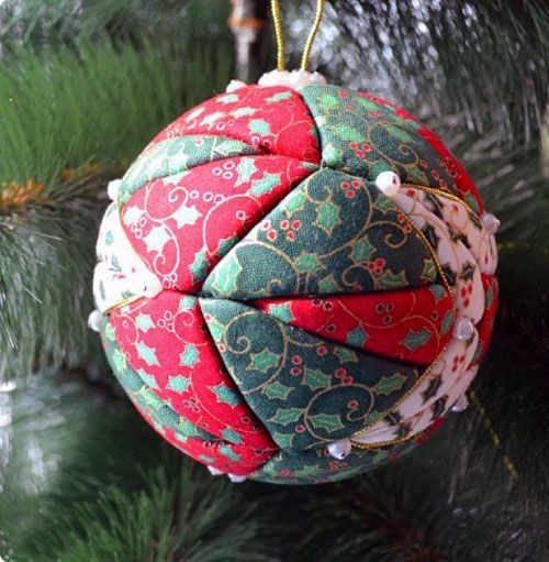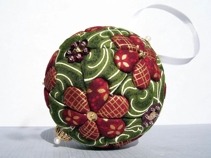 Hiasan Krismas dari bola boleh dibuat menggunakan teknik tambalan atau kinusayga. Patchwork adalah tambal sulam, dan kinusaiga hampir sama, tetapi didasarkan pada busa, dan tidak perlu ada jahitan.