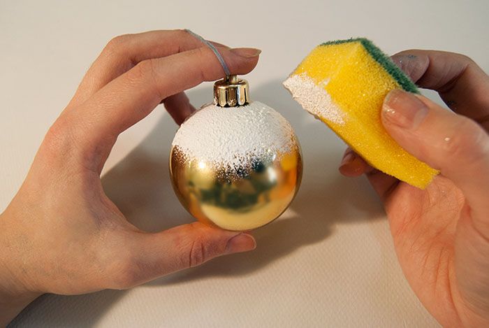 Bola Tahun Baru dengan salji diperoleh jika alasnya dilapisi tebal dengan gam PVA dan digulung dengan garam dan berkilau. Kaedah kedua adalah cat akrilik putih: ia disapukan dengan span pada mainan.