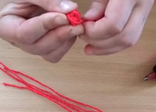 Jahit bulatan bersama-sama dengan jahitan lubang kancing dengan benang yang terang, tetapi biarkan ruang untuk disumbat. Setelah bola tumbuh dan kelihatan seperti hiasan, jahitan selesai hingga akhir.