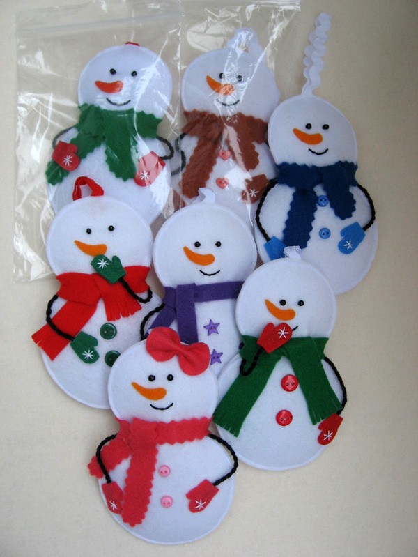 Orang salji adalah mainan yang dirasakan hebat untuk Tahun Baru. Warna putih kain bukan tenunan akan kelihatan baik di pokok, jadi kami tidak melepaskan peluang untuk memotong dan menjahit manusia salji yang comel.