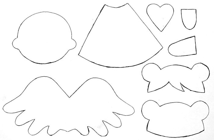 Untuk mencipta malaikat yang paling halus, kami menggunakan warna pastel dari bahan bukan tenunan: krim, kuning muda, kuning pucat, coklat susu. Tidak perlu menyulam wajah, anda boleh menggambarnya: mata dicat dengan cat akrilik hitam, dan pastel kering disapu ke pipi.
