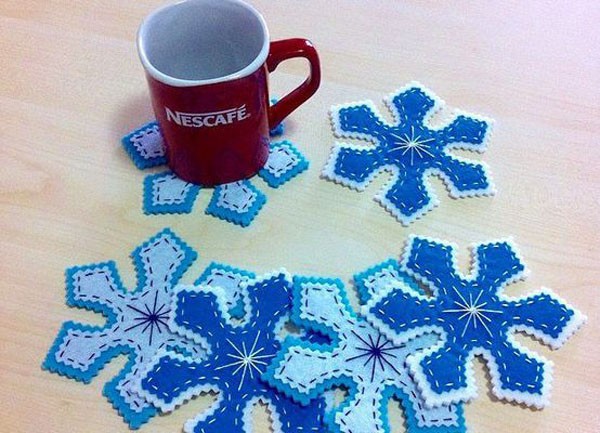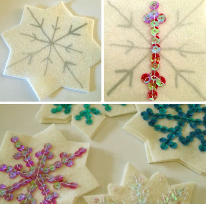 Cara lain untuk membuat kepingan salji yang indah adalah dengan memotongnya dari kain keras dan dihiasi dengan separuh manik atau kancing.