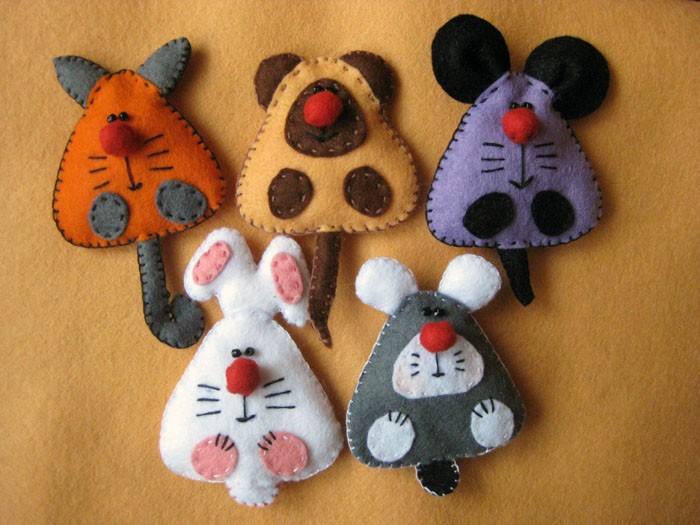 Setelah semua kepingan siap, kami mula menjahit tepi setiap gambar, meninggalkan bahagian kecil yang tidak dijahit. Kami mengisi lubang dengan pengisi dan menyelesaikan kerja. Setelah menghias, anda perlu menjahit pita ke setiap gambar: anda boleh menggantung kalungan.