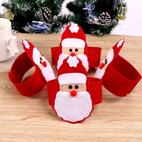 Untuk membuat cincin serbet yang indah, gunakan helai kain bukan tenunan dan elemen hiasan. Ini boleh menjadi cabang holly yang dipotong dari rasanya, wajah Santa Claus, sebuah pokok Krismas.