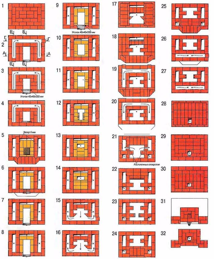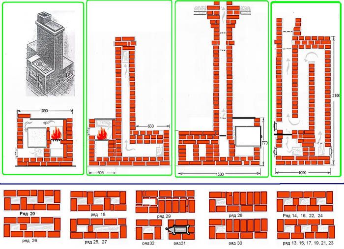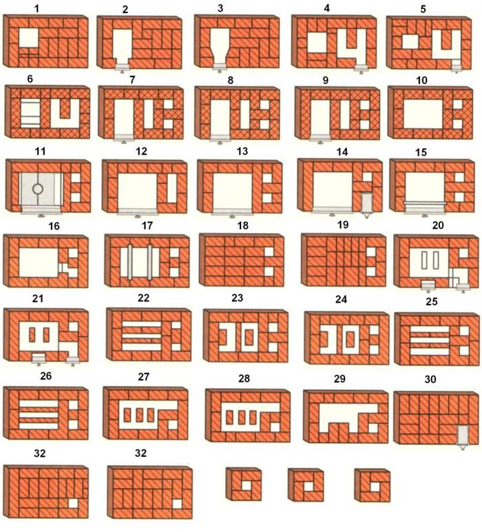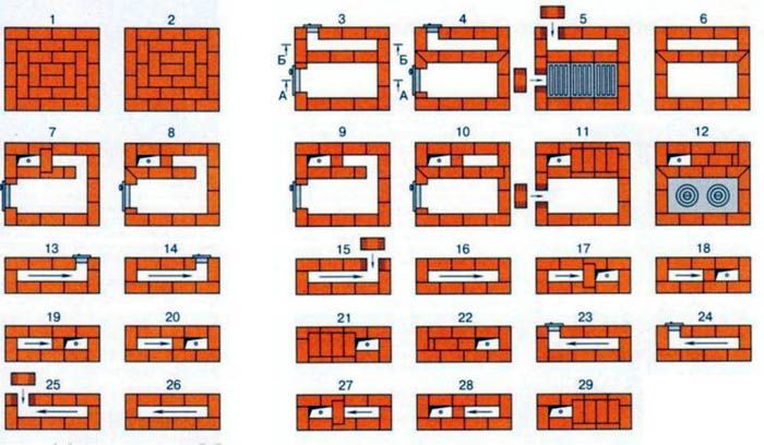 Elemen padat digunakan untuk dinding luar pemanas, tetapi perlu diingat: anda tidak boleh mengambil batu bata silikat atau berongga untuk bekerja. Pembuat kompor menasihatkan, sebelum meletakkan batu, untuk membuat "pas": meletakkan semua baris kering sesuai dengan skema yang dipilih. Teknik ini akan memungkinkan bukan sahaja untuk menentukan lokasi cerobong yang tepat, tetapi juga memeriksa semua bahan untuk kecacatan.