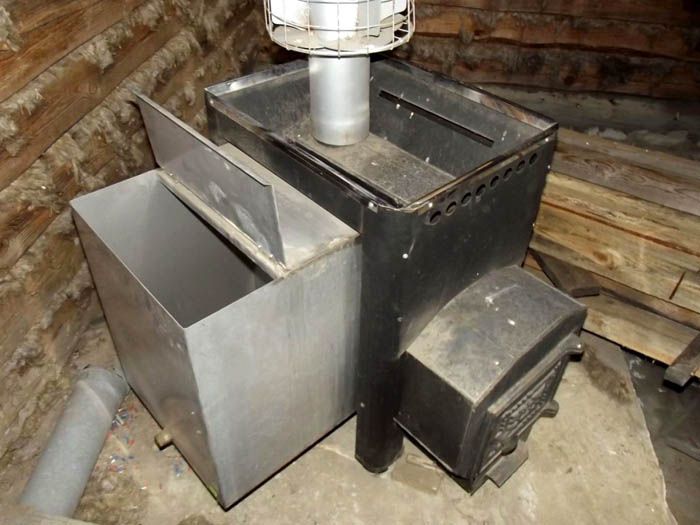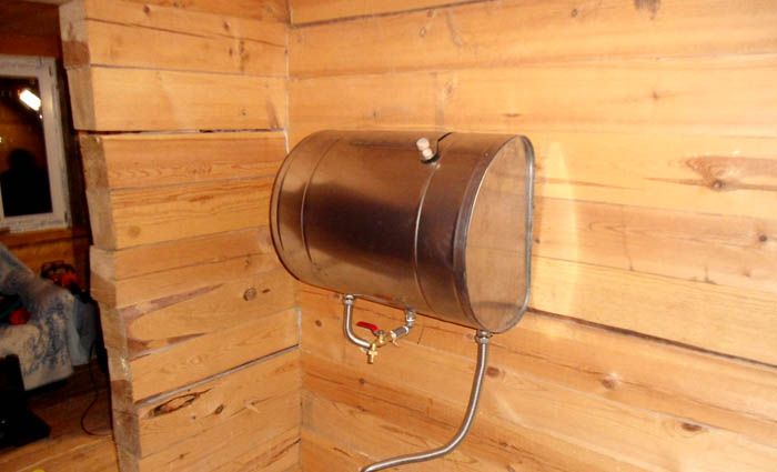 Tangki berasingan mempunyai kelebihan tersendiri - ia tidak menguap kelembapan di bilik wap dan pada masa yang sama memanaskan bilik bersebelahan. Lebih baik mengambil tangki dari keluli tahan karat, ia mampu menahan air mendidih yang curam.