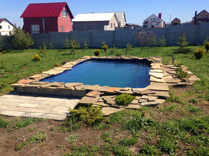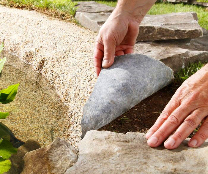 Anda boleh menghiasi takungan secara estetik dengan lapisan filem dengan kerikil. Batu-batu itu dilekatkan dengan gam kalis air pada plastik. Filem ini mengikuti lekukan garis pantai, yang kelihatan semula jadi dan indah.