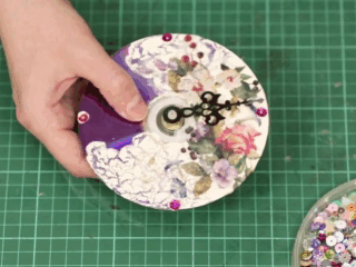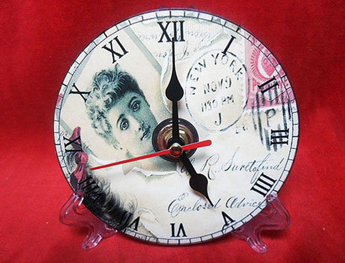 Jam di rumah juga boleh dibuat dengan tangan. Untuk melakukan ini, anda memerlukan cakera DVD yang tidak diperlukan, serbet decoupage atau kertas beras, berus sintetik yang luas, tangan dan jam, pernis craquelure.