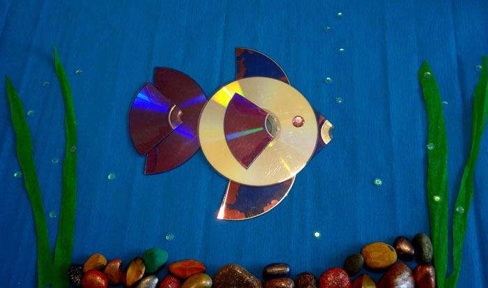 Cakera dilekatkan pada kadbod berwarna. Dengan bantuan gunting, kertas berwarna dan gam PVA, bulatan berkilat itu berubah menjadi ikan