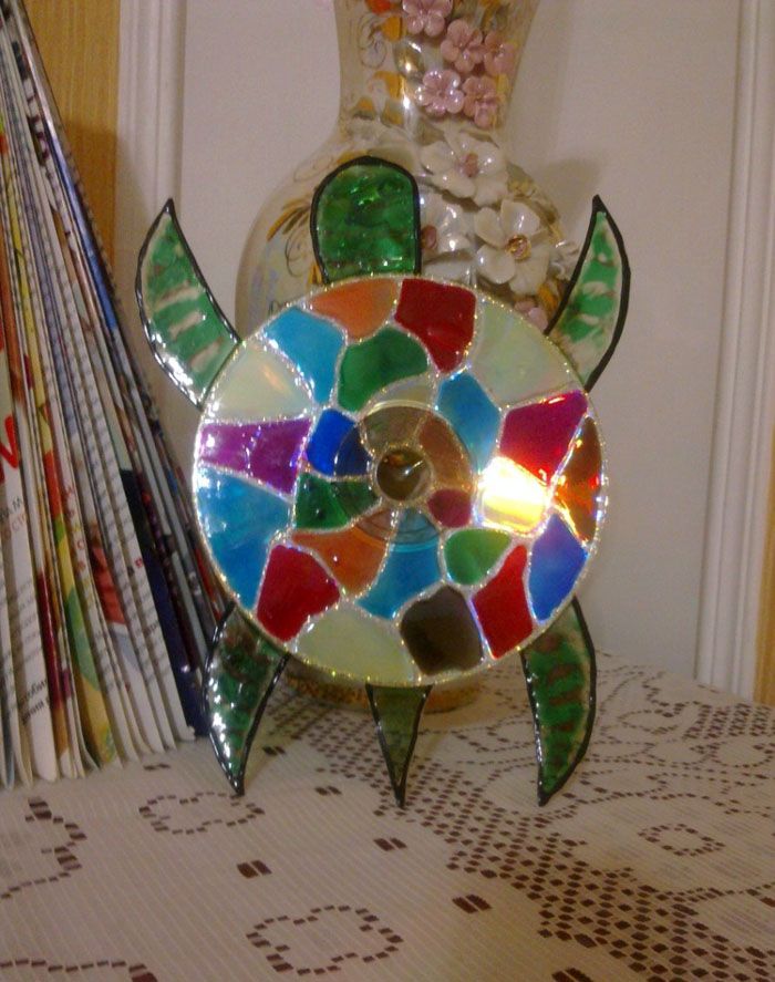 Penyu itu berdasarkan plastik dari botol, yang boleh diganti dengan kadbod. Cakera itu sendiri dicat dengan cat kaca berwarna. Untuk mengelakkan cat tidak bercampur, anda perlu membeli kontur