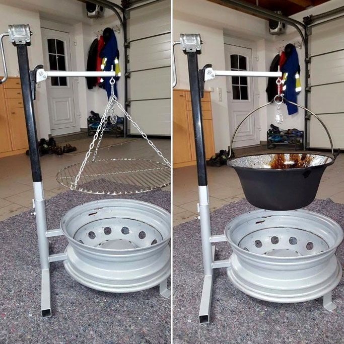Untuk membuat api, stamping sangat sesuai: kedua-dua lubang saluran udara, dan cukup ruang untuk kayu bakar dan arang. Sekiranya anda mahu, anda boleh menyatukan dua cakera tersebut dengan mengikat 4 kaki padanya - strukturnya akan berfungsi sebagai barbeku yang sangat baik untuk kuali.
