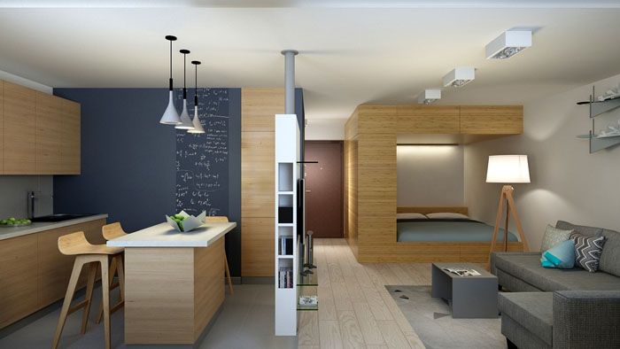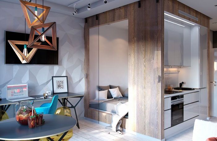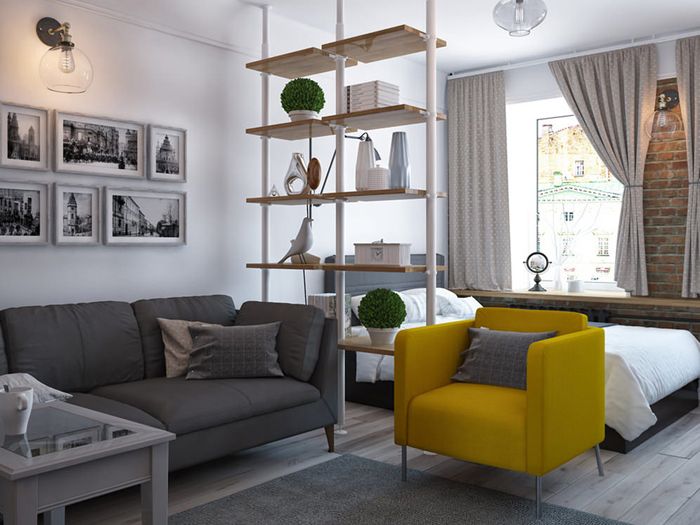 Pangsapuri studio selalunya mempunyai susun atur segi empat dan memerlukan penyesuaian visual ruang semasa pengubahsuaian. Jika tidak, pemilik mendapat satu bilik besar dengan katil, perabot dapur dan meja.
