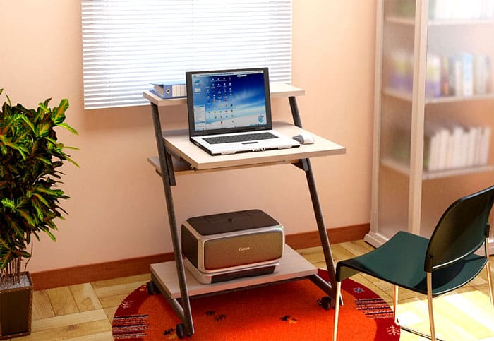 Roda di meja kecil sangat mudah, kerana jika anda mahu, struktur seperti itu dapat dengan mudah dipindahkan ke ruangan lain, apalagi dengan komputer riba yang berdiri di atasnya. Pengilang telah meramalkan kemungkinan ini dan memikirkan konfigurasi produk secara menyeluruh.
