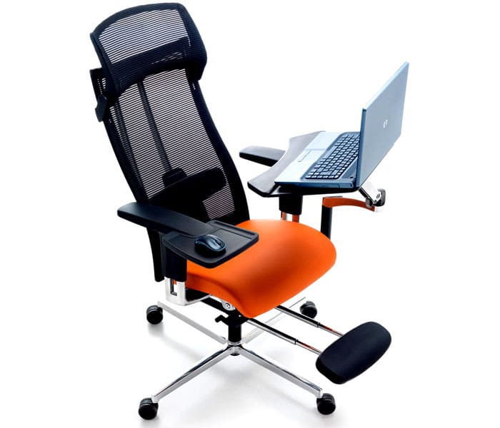 Reka bentuk yang selesa - kerusi meja. Ya, ini adalah perabot yang agak besar, tetapi melebihi fungsi dan kemudahan yang lain. Meja meja untuk komputer riba dilekatkan di kerusi, pengancingnya boleh dipercayai. Sangat mudah untuk memperbaikinya pada kedudukan yang diinginkan.