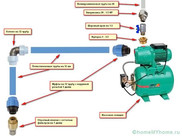 Под точката на замръзване от точката за приемане на вода тръбите са положени до къщата, където са свързани към инсталацията. Изстрелването му е възможно след изливане на вода в отвора на помпената станция. След първото стартиране трябва да проверите налягането, което трябва да бъде средно 1,5 атмосфери.