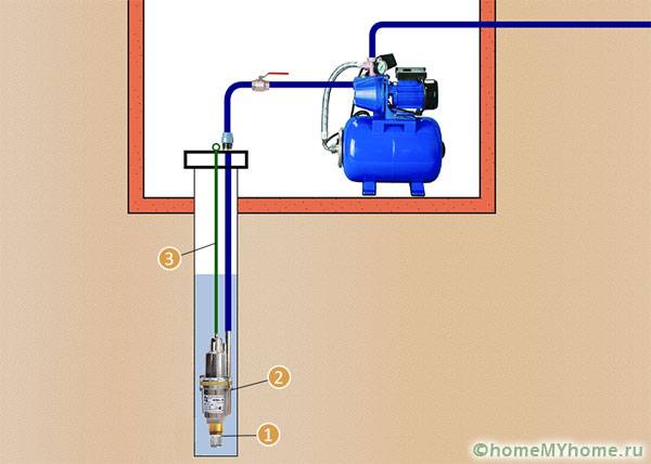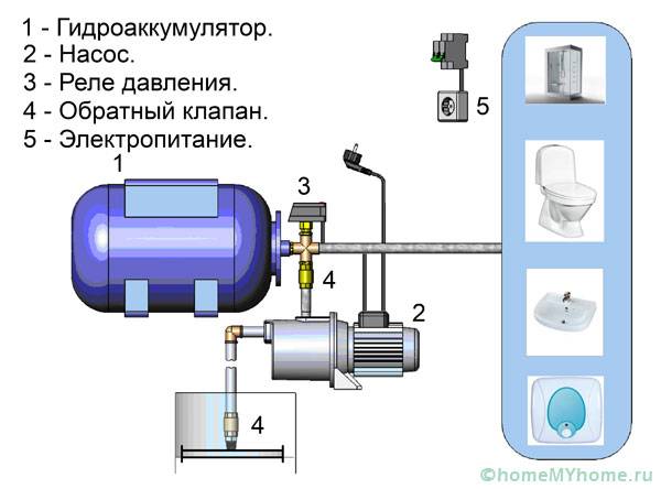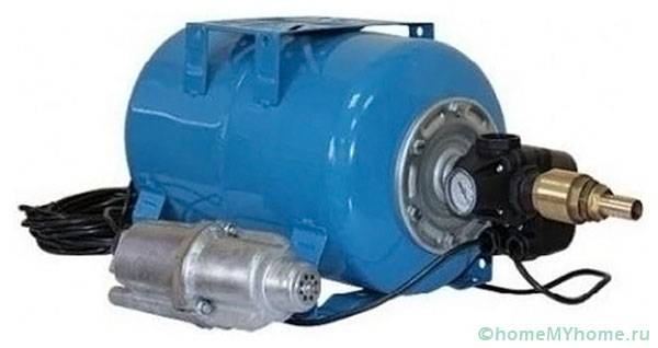 - акумулатор на налягане (хидравличен акумулатор или мембранен резервоар), който поддържа налягането във водоснабдителната система на необходимото ниво;