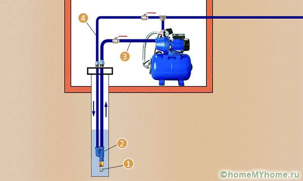 Двутръбна схема за водоснабдяване на частна къща с помпена станция (1 - възвратен клапан с филтър, 2 - ежектор, 3 - смукателна тръба, 4 - рециркулационна тръба)