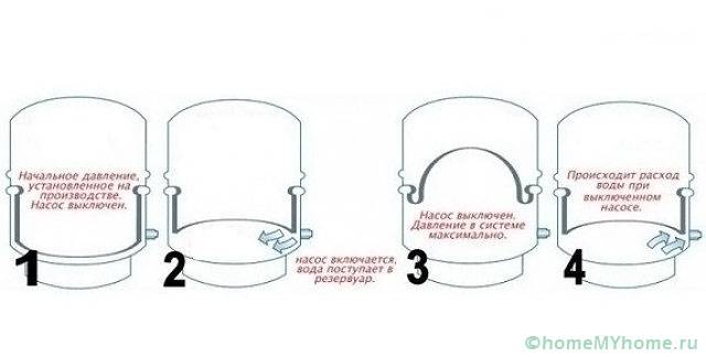 След започване на инсталацията помпата вдига вода от кладенеца, след което я насочва към акумулатора. Капацитетът на акумулатора е разделен на две части. Единият от тях съдържа въздух под налягане, а другият е предназначен за вода. Когато потребителите на вода са включени, количеството вода в резервоара намалява и налягането в системата пада.