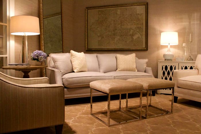 Woonkamer in zandtinten met een tint grijs en leer en metalen voetenbankjes in plaats van een salontafel is wat je nodig hebt