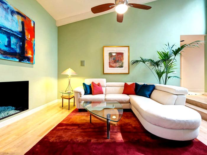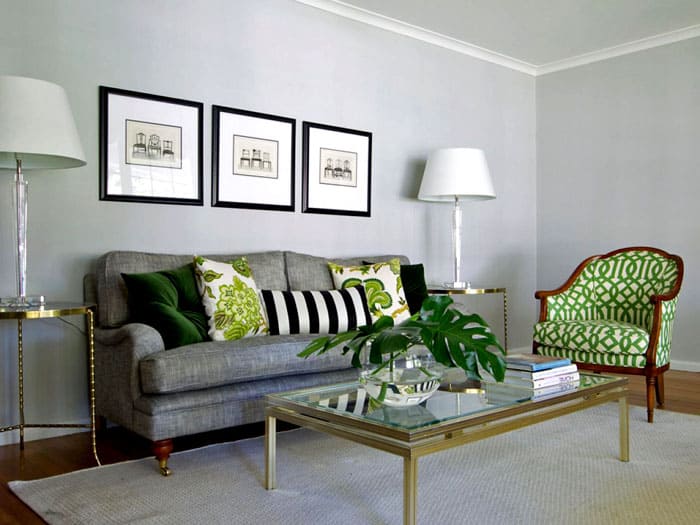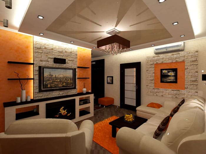 Als achtergrond kunt u neutrale tinten gebruiken waarmee u op accenten kunt spelen. Maar je moet proberen om helderdere kleuren en meubels te combineren, om de kamer sappiger te maken.