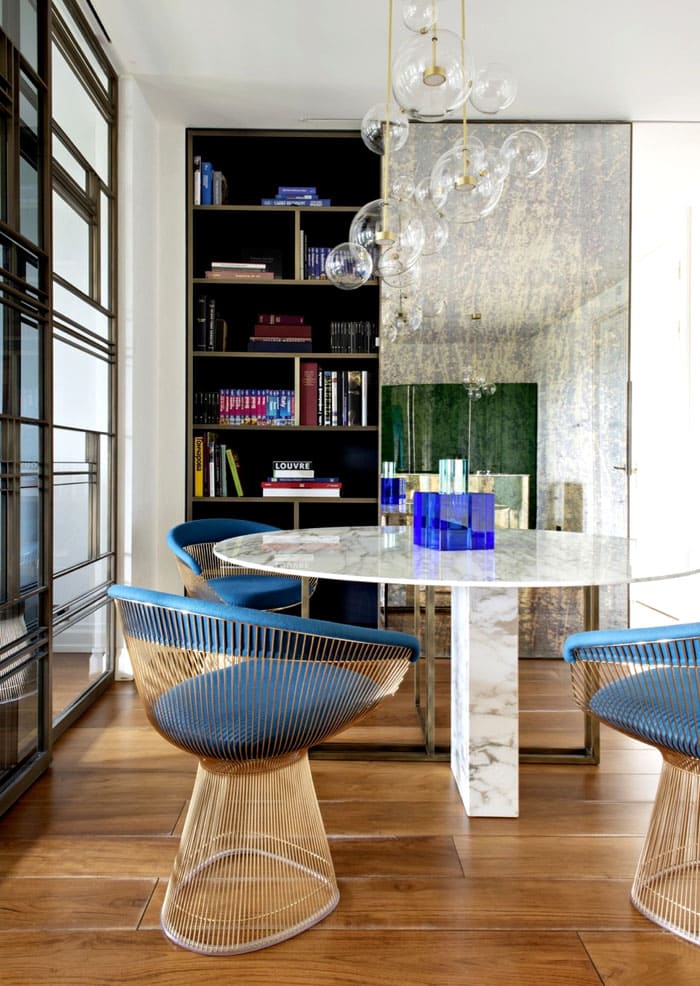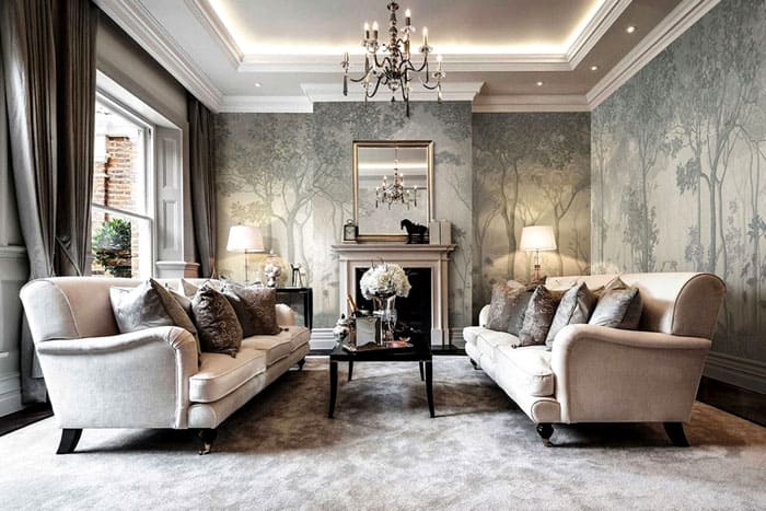Klassieke interieurs blijven modieus, maar je kunt de klassiekers op een nieuwe manier laten klinken, op een moderne manier. Om dit te doen, worden nieuwerwetse kleuren opgenomen in het uiterlijk van de kamer, waardoor het decor op een andere manier wordt gecombineerd.
