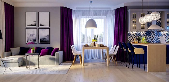 Een sappige oplossing was een nachtpaarse tint, die zowel in decor als in meubels kan worden gebruikt, in combinatie met grijs, rood of blauw