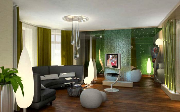 Verlichtingsapparaten moeten niet alleen nuttig zijn als lichtbron, maar ook als onderwerp voor het in zones onderverdelen van een kamer. Dit effect wordt bereikt met staande lampen of spots.