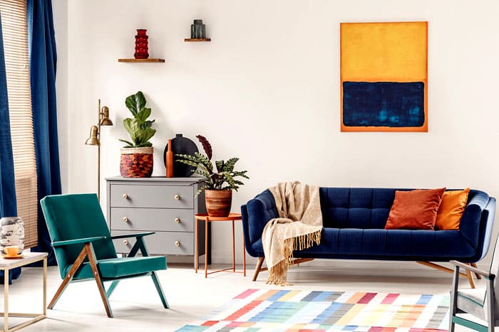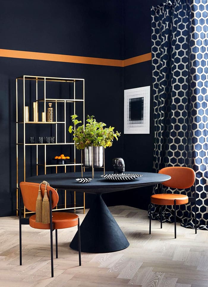 De woonkamer kan niet alleen in neutrale tinten worden ingericht, maar ook in diep donkerblauw met heldere accenten op meubels, textiel of accessoires.