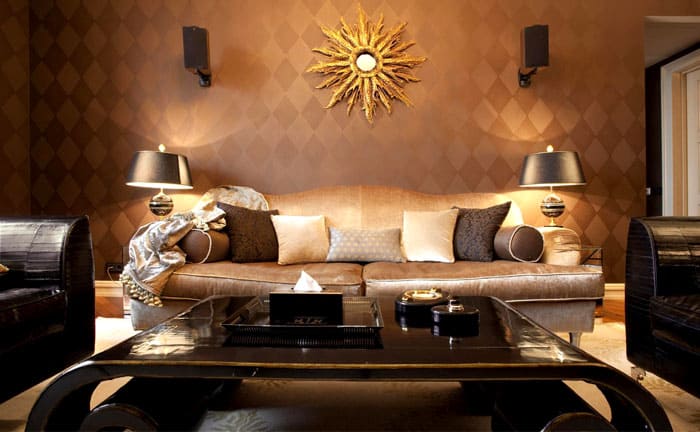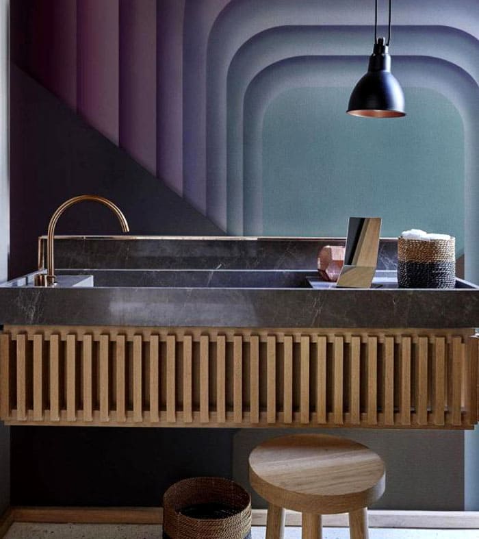 Wandstructuurgeometrie en gladde afgeronde meubellijnen breken de realiteit een beetje, waardoor de kamer grillig elegant wordt.