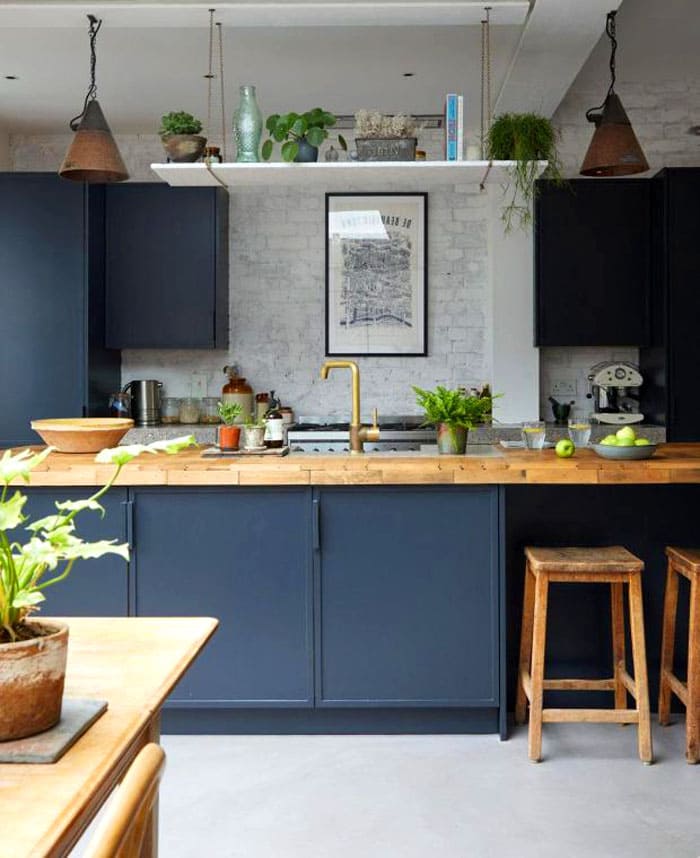 Slechts drie hoofdkleuren, rijkelijk op smaak gebracht met groene planten, maken de keuken diep en gezellig.