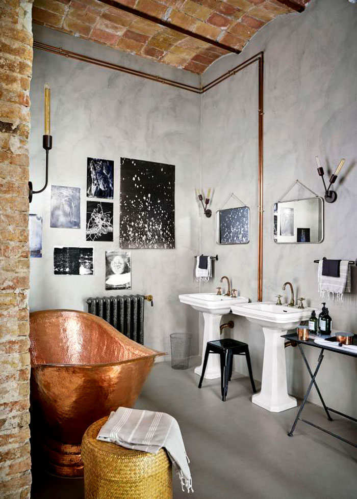 Een gewaagde beslissing om beton, metaal en baksteen te gebruiken: het plafond trekt de aandacht naar zichzelf in plaats van een simpele vloer