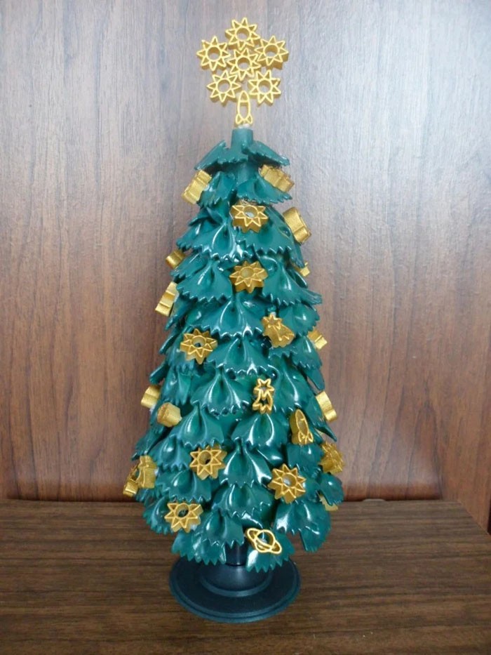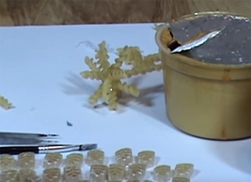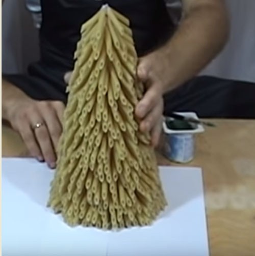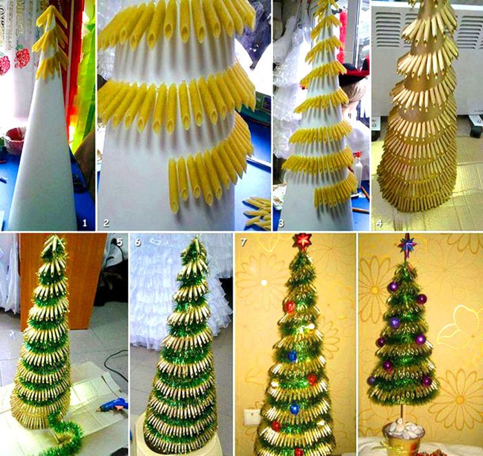 De kosten van pasta zullen geen enkele creatieve persoon op zak raken. Het vaartuig blijkt sterk, mooi, netjes en duurzaam te zijn. Kinderen kunnen ook deelnemen aan het maken van een kerstboom. Ze kunnen pasta aan de grote beeldhouwer serveren, helpen bij het schilderen van het eindproduct. In ieder geval zal er voor u bewondering worden geboden.