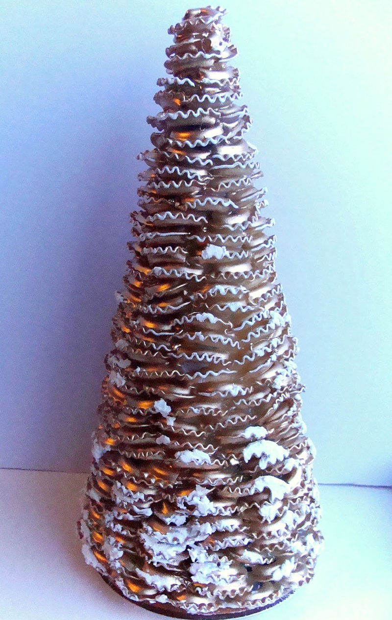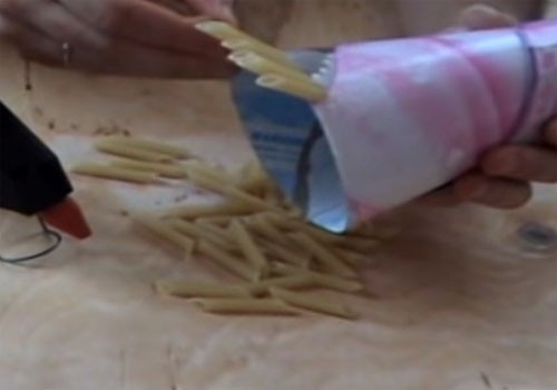 Ronde pasta is dik genoeg. Met een zorgvuldige opslag kan zo'n boom eigenaren jarenlang verrassen. Je hebt een pak ronde pasta, hete lijm en een kartonnen kegel nodig. Als het karton erg compact is, zal het vaartuig zeker nog vele jaren in de familie blijven en zal het het hele gezin elk nieuwjaar in verrukking brengen.