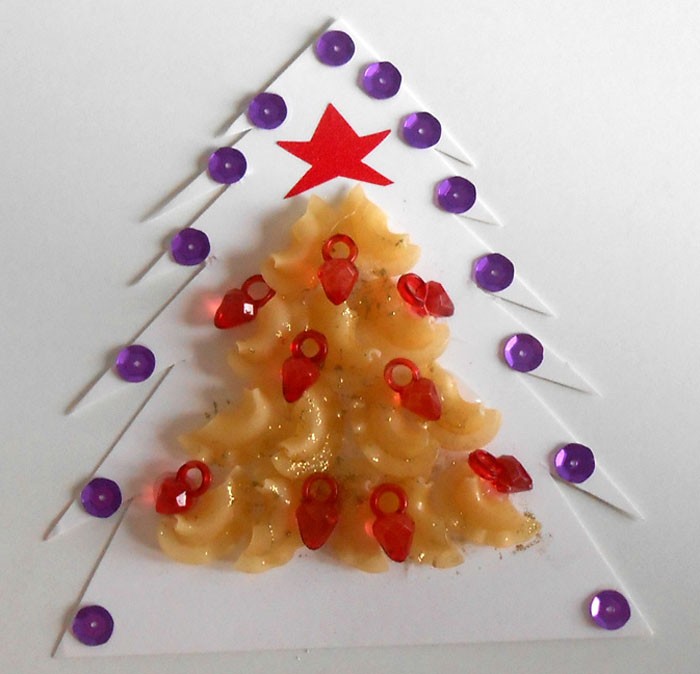 De sparrenvormige ansichtkaart ziet er origineel uit. De pasta is bedekt met acrylverf en direct besprenkeld met glitter