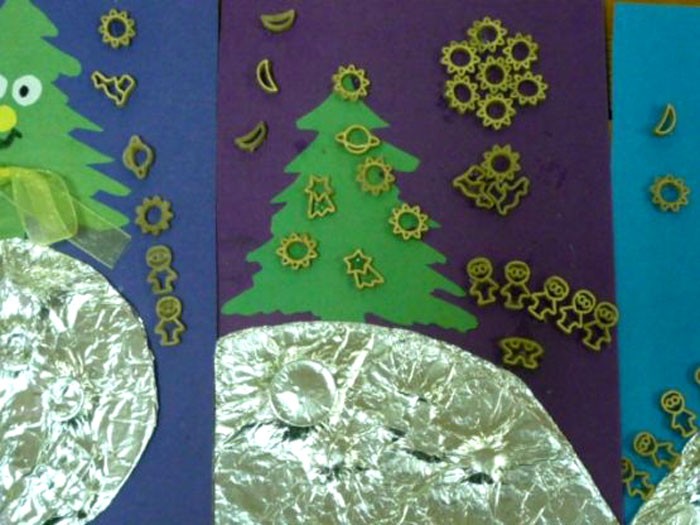 Het werkingsprincipe is als volgt: we smeren pasta in de vorm van een kerstboom op een tafelzeil en lijmen ze aan elkaar met PVA-lijm