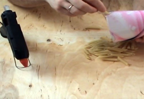 Laten we, voordat we hals over kop in een creatief avontuur duiken, alle details van het werk overdenken. Om met je eigen handen ambachten in de vorm van een kerstboom van pasta te maken, is hete lijm het meest geschikt. Dit geeft het product stevigheid en kost niet veel tijd voor het fabricageproces.